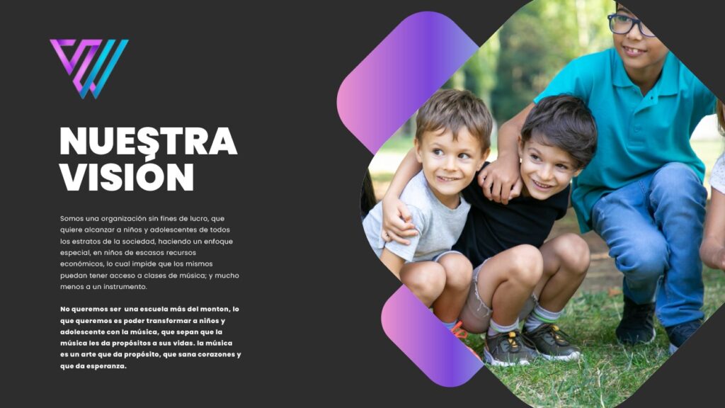Somos una organización sin fines de lucro, que quiere alcanzar a niños y adolescentes de todos los estratos de la sociedad, haciendo un enfoque especial, en niños de escasos recursos económicos, lo cual impide que los mismos puedan tener acceso a clases de música y mucho menos a un instrumento.